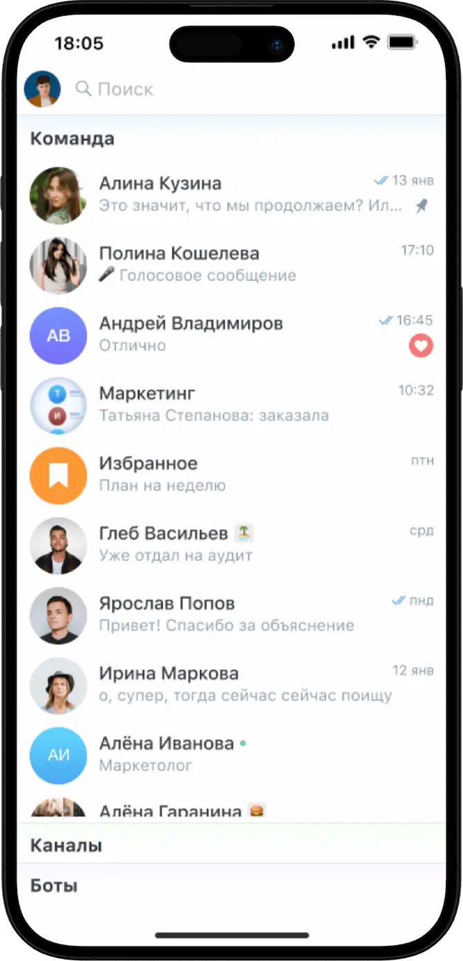 Одним кликом превращайте голосовые сообщения коллег в текст. Группируйте чаты и каналы в папки. Ставьте реакции и добавляйте сообщения в Избранное. Настраивайте уведомления и порядок сортировки.